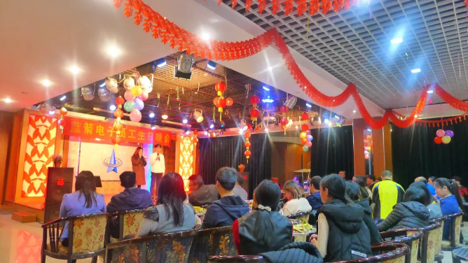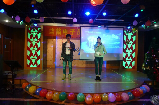 藍箭電子12月份生日晚會與圣誕晚會一起在圣誕節當天舉行,本月生日晚會由公司工會和團委一起舉辦、二分廠團支部承辦,會場洋溢了濃濃的圣誕氣氛,晚會開始前還有圣誕老人為同事們派發蘋果、糖果等小