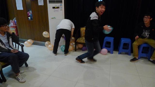 第三個游戲:踩氣球(壽星們的積極參與使現(xiàn)場洋溢的樂洋洋的氣氛)